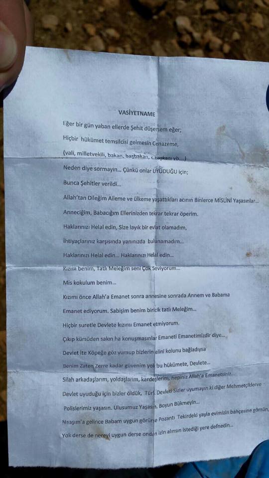 Şehit haberi almadan maalesef günlerimiz geçmemektedir. Ancak bugün alınan şehit haberinden sonra şehitlerden birinin cebinden çıkan VASİYETİ yürekleri dağladı. Haber medyalarında paylaşılır mı, sosyal medya da var mı bilmiyorum ancak ulaştırılan bu VASİYETİ sizlerle paylaşmadan yapamayacağım.
